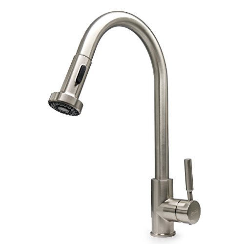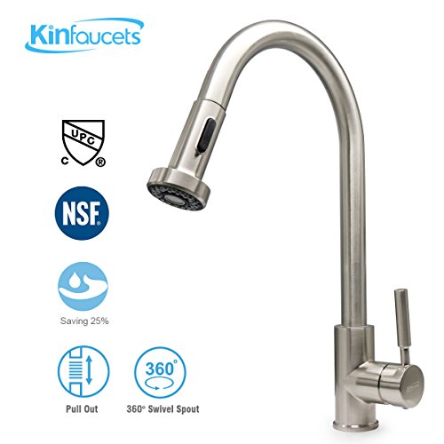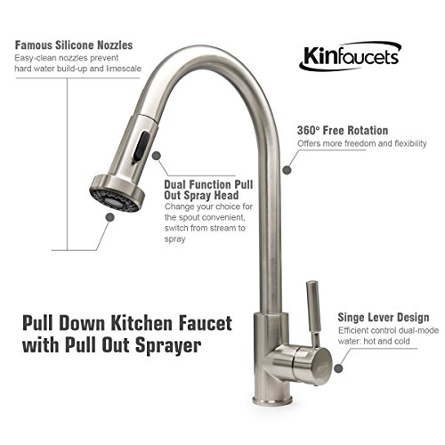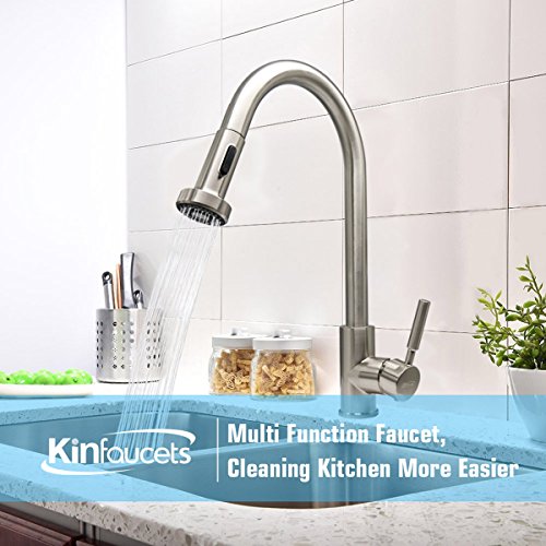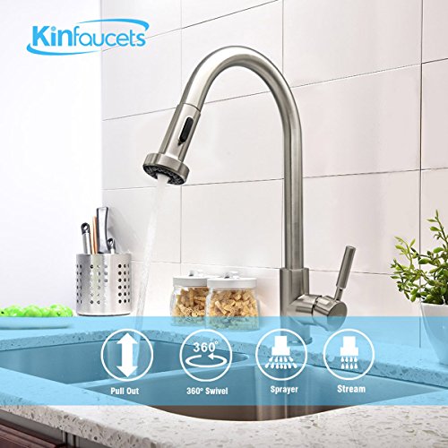 KINFAUCETS Kitchen sink faucet, Brushed Nickel, Single Lever, One Hole, Dual Function Stream and Pull Out Sprayer, 360 Degree Swivel Spout, Hot & Cold Mixer, Bar, Bathroom, Lavatory, Vanity