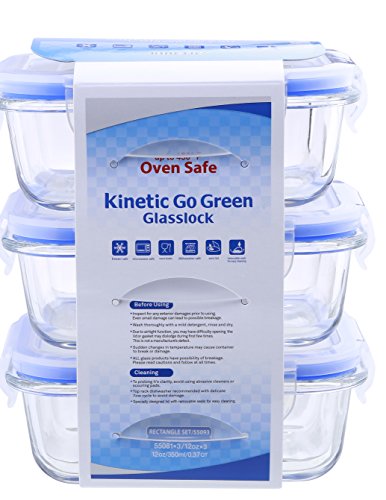 Kinetic brings you the best in food storage with their stylish and unique Go Green Glasslock Elements series designed for reheating leftovers and convenient refrigerator/freezer storage. BPA Free and FDA Approved. The durable 6 piece Glass Food Storage Container Set includes 3 Rectangular 12oz Containers and 3 Lids. Elements features a vented plastic lid with a four tab locking system with a silicone seal that creates an airtight/watertight seal keeping foods fresh longer than ordinary food storage solutions. Containers may be used in the oven up to 450⁰ Fahrenheit without the lid. Freezer, refrigerator, and microwave safe with lid attached; the set promises easy cleanup in the dishwasher (top rack recommended for the lids). Bake or reheat food and take the container directly to the table. This simple and elegant design keeps kitchen leftovers organized neatly and with a minimum of fuss. Stackable durable containers optimize your storage space in the refrigerator or cupboard and also nest to save space. Out of box product dimensions in inches: 12oz = 6x4.25x2 1 Year Limited Manufacturer Warranty