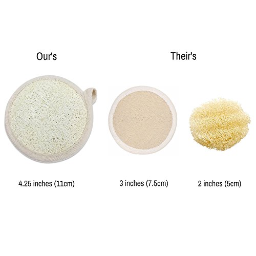 -. Feature : SMOOTH AND CLEAR SKIN- Luffa pads are great for men, women and teens. Exfoliating your face, legs, arms, chest and back with our loofah sponges gently removes flaky dead skin cells, reduces acne/pimples, backne (back acne), blackheads and whiteheads and stimulates blood circulation and cell regeneration. After exfoliating, use our Clarifying Organic Facial Oil to moisturize and combat acne-prone skin, eczema, rosacea, backne (back acne). / NO MORE INGROWN HAIRS/FOLLICULITIS-Men can relieve and prevent ingrown hairs/folliculitis by gently exfoliating their face regularly resulting in smooth and clear skin. Before shaving, women can use our loofah pads to exfoliate their legs to relieve and prevent ingrown hairs/folliculitis. Your legs will feel super soft and smooth! / ALL-NATURAL - Loofah is a fibrous vegetable that swells like a sponge and softens when it is wet. It is environmentally friendly and safe to use on all skin types. The terry side of our luffas makes it gentle for even sensitive skin types and good for overall washing. Our loofahs are non-toxic and 100% natural. / EXTRA LARGE - our loofah pads are almost double our competitors' and larger than most round loofah buffing pads. Over 4 inches in diameter, our round luffa sponges are great for facials or for scrubbing and washing your body in the bath, spa, or shower. Give it a try, your face and skin will feel and look amazing. / MISSION - We are a veteran/family-owned small business. When you purchase any of our products you partner with us to make a difference in people's lives. A portion of our proceeds goes back to our communities. We support veterans, emergency responders, and needy children and families in the U.S. and around the world.