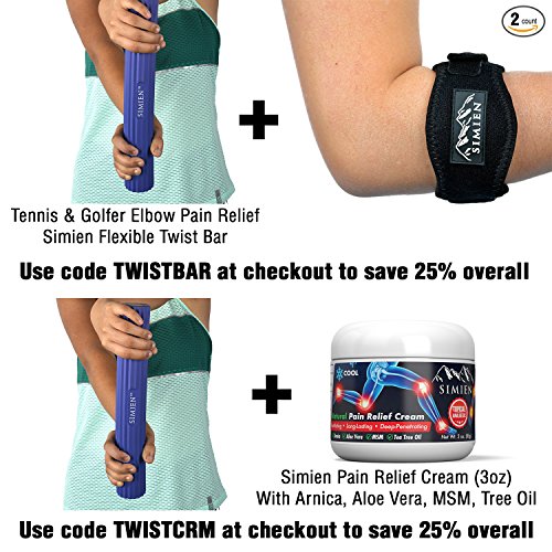 ✔ MUSCLE TISSUE & JOINT PAIN RELIEF: Can be used for tennis elbow, golfer’s elbow, computer or mouse elbow, rower’s elbow, fishing elbow, pool or billiard elbow. Also for repetitive motions that cause lateral epicondylitis, elbow tendinitis, carpal tunnel syndrome or arthritis pain. The Simien Tennis Elbow Brace (see 25% off combo deal below) provides immediate elbow support and pain relief but the Simien Flexible Rubber Twist Bar can also prevent future injuries via flex & twist motions.