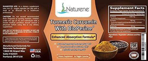 Naturene Premium Turmeric Curcumin with BioPerine, 1400mg, 60 vcaps, 95% Curcumenoid, Joint Support & Pain Relief, 20X Increased Potency