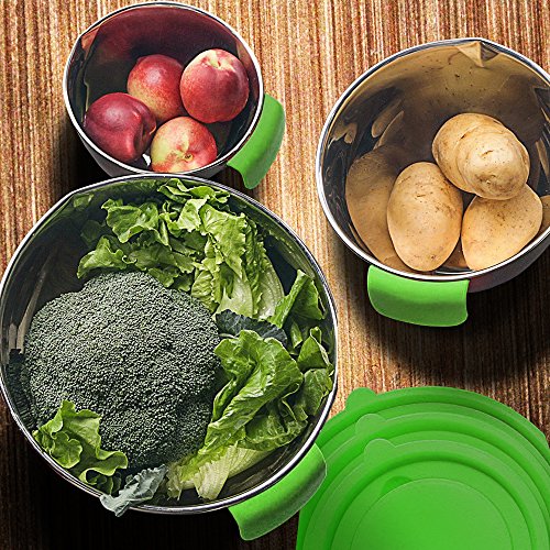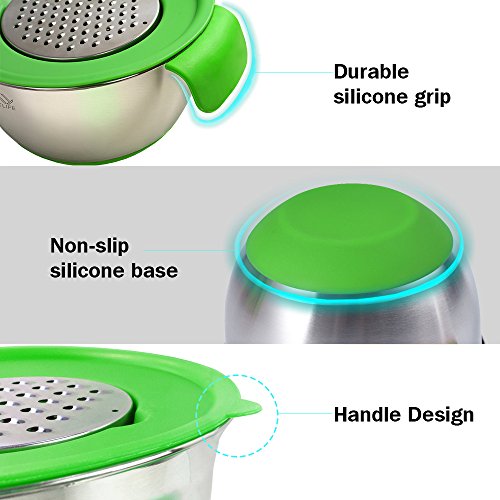 【3 INTERCHANGEABLE BLADES】: This Mixing Bowl Stainless Steel NonSlip Set set is improved with lids for each bowl and the 3 cutting vegetables and fruits adapted to each lid freely. You can sliced vegetables and cheese in all the bowls you need.
