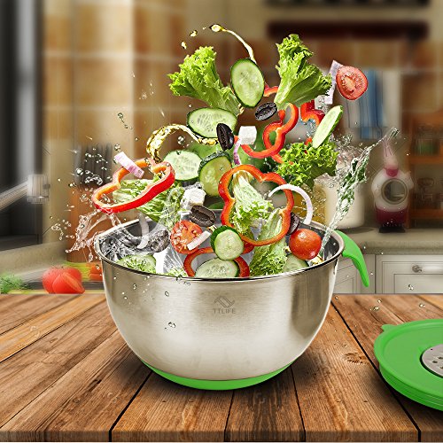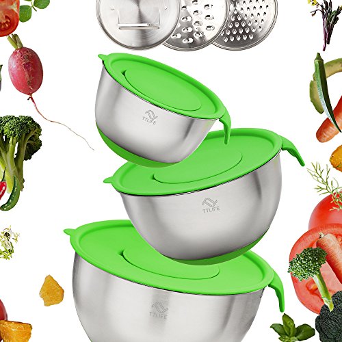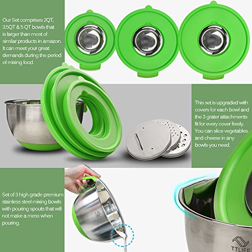 TTLIFE Mixing Bowl Stainless Steel NonSlip Set with Lids, Pouring Spout, Handles, Silicone Stockings and 3 Fruit and Vegetable Cutter Blades - Set of 3 Large Capacity Units Including: 2L / 3.5L / 5L