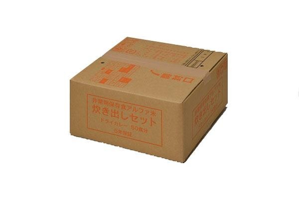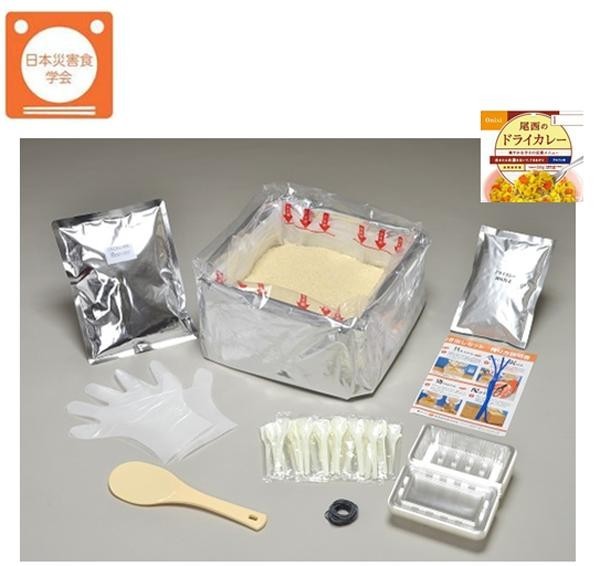 | セット内容 | アルファ米50食分、具材(大豆たん白、コーン、人参)×1、ドライカレー×1、弁当容器×50、スプーン×50、輪ゴム×50、しゃもじ×1、開封用カッター×1、衛生手袋×1、針金入りビニール紐×3、作り方説明書×1 |