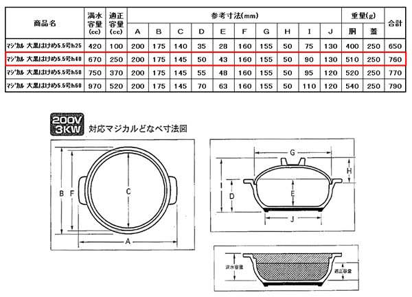 | 仕様 | 満水容量:670cc 適正容量:250cc 調理器SG認定商品 対応熱源 IHクッキングヒーター (200V/3KWまで対応) (卓上IH調理器:100V/700W~) ラジエントヒーター ガス直火 電子レンジ ハロゲンヒーター シーズヒーター |