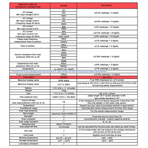 - * MULTI-FUNCTIONS: Measure AC current, AC/DC voltage, frequency, electric resistance,line on/off test, capacitance, temperature; allowable Max voltage between terminal to be measured and ground: DC 600V or AC 600V RMS