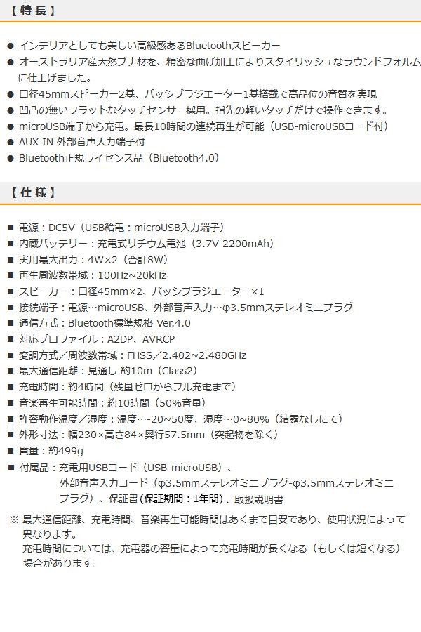 | オーストラリア産天然ブナ材を使用。精密な曲げ加工によりスタイリッシュなラウンドフォルムに仕上げました。ナチュラルで温かみのあるデザインでインテリアとしても美しいBluetoothステレオスピーカーです。 |
