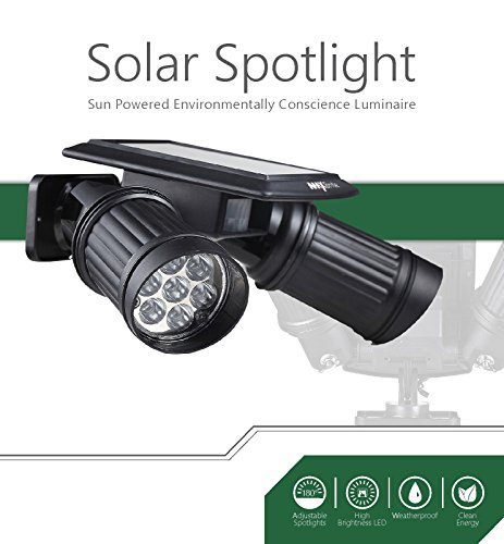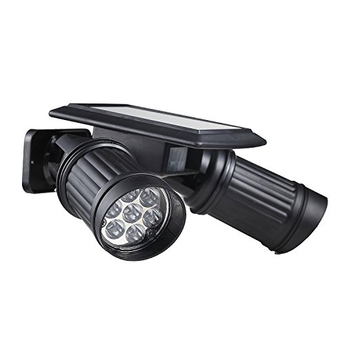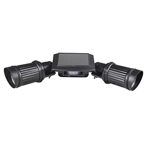DUAL HEAD LED SOLAR SPOTLIGHT featuring an infrared motion sensor activates when movement is detected within 15 feet after dusk