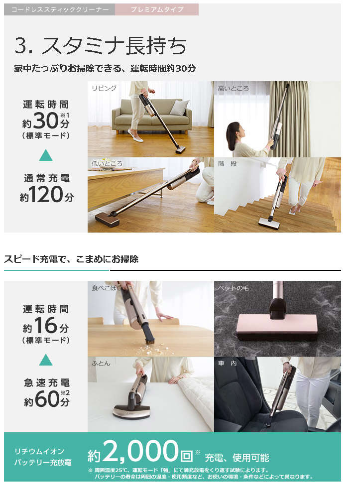 ●連続運転時間が30分と従来品比約1.5倍となり一度の充電でしっかり掃除。