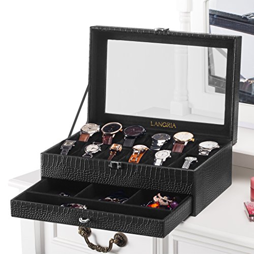 Studio : LANGRIA Publisher : LANGRIA Binding : Kitchen Product Description All-black watch and jewelry showcase box This new 2-layer watch and jewelry display box has an eye-catching design with premium synthetic crocodile leather exterior, a see-through large glass on the top, and a soft black flocking lining interior to protect your accessories from scratches. The top layer has 12 compartments in 2 different sizes to perfectly fit watches or bracelets of different sizes for men and women. Each compartment has a soft removable cushion. The bottom layer is a jewelry and accessories pull-out drawer tray with 4 compartments for your cufflinks, earrings, rings, necklaces, chokers, brooches and more.