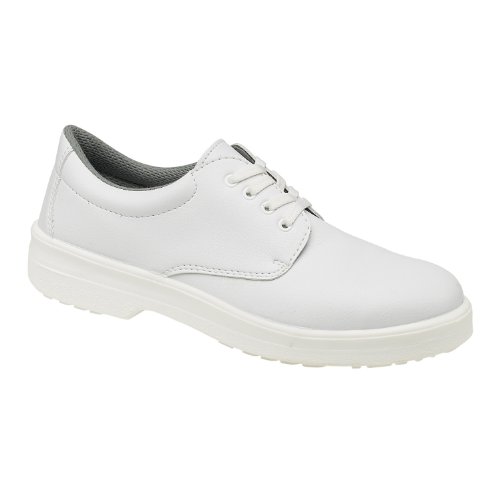 -. Feature : Ideal where hygiene and cleanliness are of most importance. / Mono-white leather upper with plain lace-up, four eyelet front. / Machine washable fiber breathable upper. / Mono-density PU Sole designed for optimum slip resistance. / Padded ankle collar and antibacterial fabric lining for comfort.