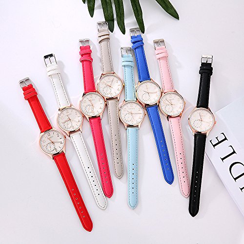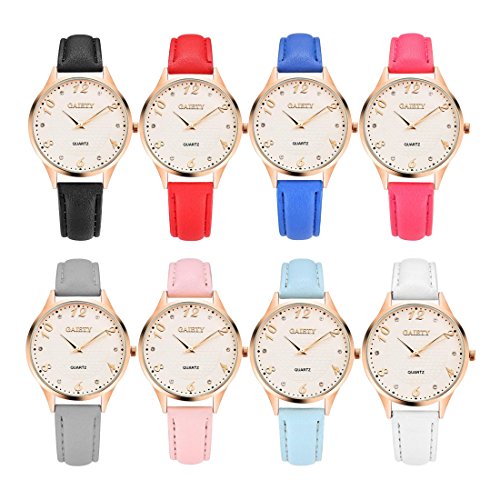 -. Feature : Case Material: Alloy; Dial Material: Stainless Steel; Dial Window Material: Glass; Band Material: PU leather / Movement: Quartz; Case Shape: Round; Dial Display: Analog / Size:case:38*38*8mm,band :240*20mm; Waterproof: No / Style: Fashion & Casual; Occasions for gifts:Advertising and promotion, business gifts, holiday, housewarming, birthday, travel / Quantity: 8 PCs, Color: Red, White, Hot Pink, Gray, Sky Blue, Blue, Pink, Black