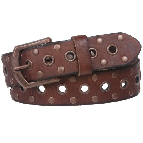 *This leather belt, oil-tanned, soft hand feeling, vintage, distressed looking, with grommets and studs hardware decoration down the strap, features snap on removable buckle, optional for you to switch any of your favorite buckles. Color: Available in Brownish Black with antique silver color hardware as pictured, Brown with copper color hardware.Notes: the size chart does not include buckle length. It is recommended to select size matches measurement of your waist or where you wear this belt. It would be more comfortable to select a size that is about 1" or 2" bigger than the actual measurement of your waist or where you wear this belt.Feature