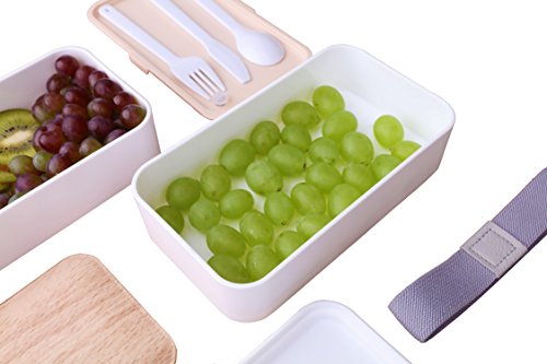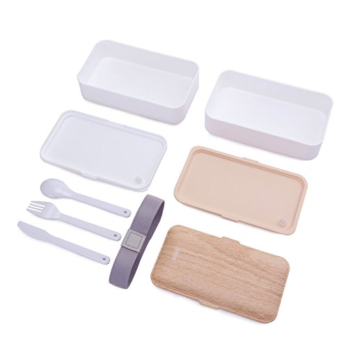 TWO STACKABLE COMPARTMENTS. COMPLETE UTENSILE SET. The bento box is designed with two separate food compartments which will help you to become a better food organizer and store different foods separately. Each compartment internal size is 7” by 4” by 1.5”. The package also includes a complete set of utensils.