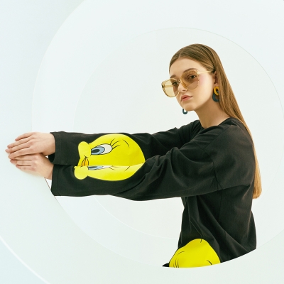 디자인 : 롱슬리브의 소매와 몸판에 루니툰 캐릭터의 얼굴을 각각 프린트하여 입었을때 소매와 몸판의 얼굴이 이어지도록 보이게 디자인.