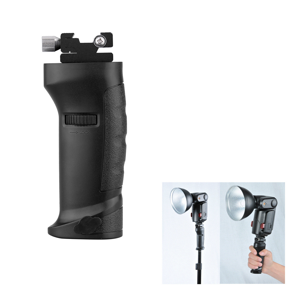 This professional flash holder can be mounted on the flash bracket or under a speedlite for handheld use.