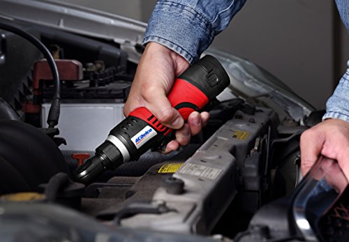 - Feature : Compact size of 9-9/16" height and only 1.54 lbs. / Durable metal gearbox with 27 ft-lbs for max. torque application. / Angled compact head allows to safely use this tool in narrow spaces and safety lock design. Anti-slip soft grip. / Forward and reverse lever for easy operations. / Built-in LED light for convenient illumination during work.