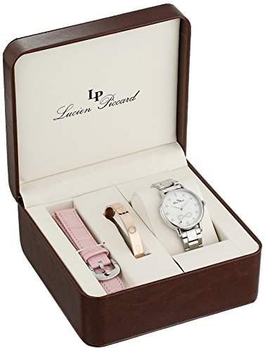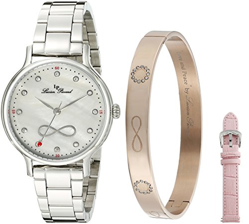 -. Binding : Watch -. Brand : Lucien Piccard -. Color : Silver/White MOP -. Department : womens -. EAN : 0722630606062 -. Feature : Stainless steel bracelet watch with mother-of-pearl dial featuring white crystal indices and infinity symbol at bottom middle / 36 mm stainless steel case with synthetic-sapphire dial window / Japanese quartz movement with analog display / Stainless steel band with deployant-clasp closure / Set includes crystal-accented and engraved bangle and interchangeable watch band with buckle closure / Water resistant to 50 m (165 ft): In general, suitable for short periods of recreational swimming, but not diving or snorkeling -. Label : Lucasarts -. Manufacturer : Lucasarts -. Model : LP-40039-02MOP-SET -. MPN : LP-40039-02MOP-SET -. PackageQuantity : 1 -. PartNumber : LP-40039-02MOP-SET -. ProductGroup : Watch -. ProductTypeName : WATCH -. Publisher : Lucasarts -. Studio : Lucasarts -. Title : Lucien Piccard Women's LP-40039-02MOP-SET Eterno Analog Display Japanese Quartz Silver Watch -. UPC : 722630606062