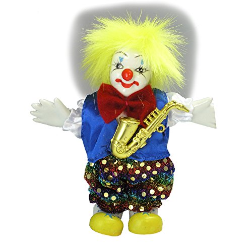 Clown Figurine - Yellow Hair and Saxaphone, Hand-Painted, Posable, Porcelain, 6" Height