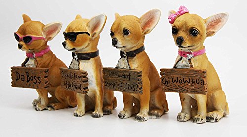 - These adorable chihuahua dogs carry signs that say 'Da Boss', ' say hello to my little friend', 'You want some of this' and 'Chi Wowhua'. They are individually hand painted and polished. They make perfect decorative pieces for your desk, shelves, and anywhere you can think of. If you have a chihuahua at home and you adore them to death, then these figurines are perfect for you. Gift them away to your chihuahua lover friends and loved ones too!