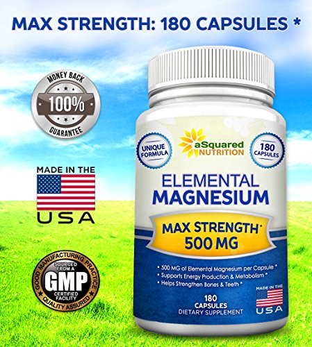 -. Feature : MAXIMUM STRENGTH ELEMENTAL MAGNESIUM: Our maximum strength Magnesium formula contains 180 capsules of 500mg Elemental Magnesium, is backed by our 100% MONEY BACK GUARANTEE and is made right here in the USA in an FDA-registered and GMP-certified facility. Our potent formula contains 500mg of Magnesium per vegetable capsule that is a carefully formulated blend of Magnesium oxide and citrate to optimize concentration and bioavailability. * / MAX CONCENTRATION & BIOAVAILABILITY: Our potent blend provides a highly concentrated dose of Magnesium that is easily absorbed and utilized in the body. Don't be fooled by Magnesium supplements that are highly concentrated but have low bioavailability, or vice versa. The key to an effective Magnesium supplement is concentration coupled with bioavailability. Our complex was carefully formulated to maximize both concentration and bioavailability promoting max absorption with minimal side effects. / BENEFITS OF ELEMENTAL MAGNESIUM: Our Elemental Magnesium formula supports energy production and metabolism, helps strengthen bones and teeth, supports muscle and enzyme function, and promotes bowel regularity. Additionally, Magnesium supports cardiovascular, nervous system and immune system health. Many people suffer from Magnesium deficiency. Taking a Magnesium supplement may help restore normal levels of Magnesium in the body. * / BEST VALUE AVAILABLE ON AMAZON: Backed by our 100% MONEY BACK GUARANTEE, each bottle contains 180 veggie capsules, which is to not be mistaken with other forms of this product such as powder, high potency liquid support, chelate flakes, glycinate drop, powdered malate, organic drink, chloride salt, soft gel cap with calcium, tarate, threonate, chewable gummies, vegan jelly gummy, sublingual vcap, chew, patch, gelcap, vit softgel, and packet lozenges * / PROVEN TRACK RECORD: aSquared Nutrition takes P.R.Ide in quality and reliability. You'll love our ever-expanding product line from CoQ10 400mg (Coenzyme Q10) to Garcinia Cambogia. Newer products include Caralluma Fimbriata, Methyl B12, Vitamin D3 K2, Milk Thistle 1000 MG, 5-HTP, Forskolin, Resveratrol, DHEA 100 MG, Biotin 10,000 MCG, CLA 1250, Turmeric Curcumin, Colon Cleanse, Green Coffee Bean Extract, Candida Cleanse, Krill Oil, Horny Goat Weed, Panax Ginseng, Ashwagandha & Rhodiola Rosea. *