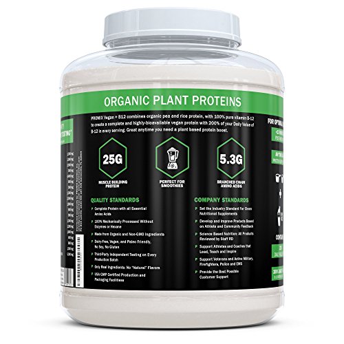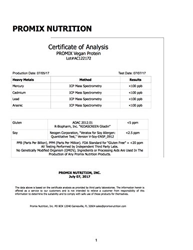 ReleaseDate : 2017-10-16 Studio : ProMix Nutrition Publisher : ProMix Nutrition Binding : Health and Beauty Product Description ProMix Vegan combines pea and rice protein, with 100% pure Vitamin B-12 (methyl cobalamin) to create a complete and highly-bioavailable vegan protein with 200% of your Daily Value of B-12in every serving. Non-GMO verified peas and whole grain brown rice are 100% mechanically processed without enzymes, hexane, or bleaching agents and then blended with non-GMO 100% B-12. Each serving of ProMix Vegan contains 25g of complete protein and 5.3 grams of Branched Chain Amino Acids. ProMix Vegan B-12 uses only non-GMO, non-synthetic 100% B-12 (no carriers or fillers). Methyl cobalamin is the most bioavailable form of B-12. Perfect for a shaker bottle or blender. FOR OPTIMAL RESULTS: Mix 2 scoops with 12-16oz of water our your favorite beverage within 15 minutes of finishing your workout AS A PROTEIN SUPPLEMENT: Mix 2 scoops with 8-12oz of water 1-3x/day 100% Vegan No Artificial Flavors, Colors, or Sweeteners No Bleaching No Soy or Gluten Third-Party Independent Testing No GMO Ingredients ProMix is 100% Made in the USA. Supporting animal welfare, small farms, and sustainable farming. Promix exceeds all testing standards for purity and performance. All ProMix products are tested by independent third party labs for heavy metals and gluten. No Soy or Gluten No Artificial Flavors, Colors, or Sweeteners No Antibiotics No GMO Ingredients 0