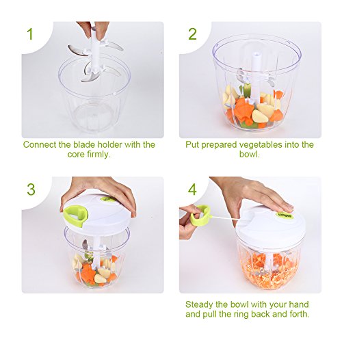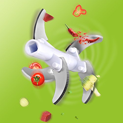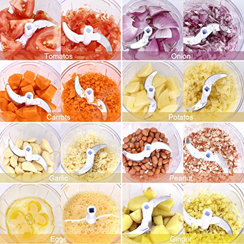 HIGH EFFICIENCY: Five sharp blades, perfect for chopping vegetables, dicing fruits, blending boneless meat and more. 1000 ml capacity, quite enough for kitchen use, travel and camping.