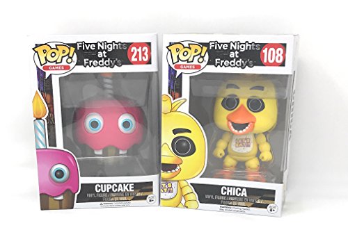 -. Feature : each figure stands 3 ¾ inches tall / both pops are from the Five Nights at Freddy's Series / Cupcake is pop #213 / Chica is pop #108 / comes in windowed display box