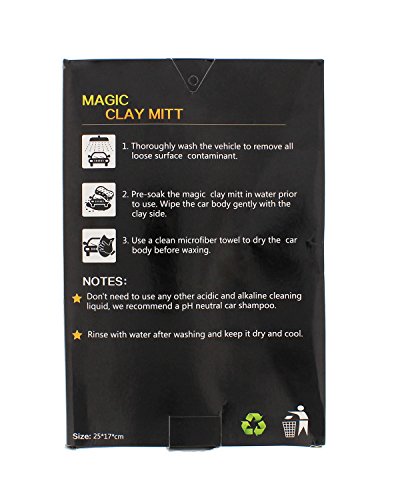 -. Feature : Practical: The ABN Clay Bar Mitt removes grime, dust, asphalt, paint overspray and iron from your vehicle within 5 minutes / Easy to Use: Pre-soak the clay mitt in water, wash your vehicle, and then use the mitt to wipe away remaining surface contaminants; The clay side is used for loosening contaminants while the microfiber is used to cling to those contaminants / Adjustable: Strap allows you to loosen or tighten the mitt to accommodate any sized hand / Simple Storage: Rinse mitt with water after use and keep in a dry and cool place / Dimensions: 10 inches x 7 inches (25cm x 17cm); Working clay surface is 6 inches x 7 inches (15cm x 18cm)
