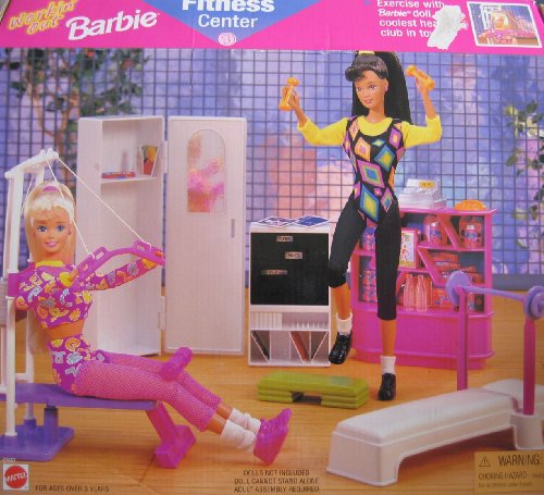 -. Feature : Workin' Out Barbie Fitness Center is a 1997 Arcotoys, Mattel production. / Includes: Weight Bench w/Barbell Support, Locker, Stereo Entertainment Center, Counter & Display Unit, Barbell, Exercise Set, Step for Aerobics, Hand Weights, Water Bottles, Soda Cans, Health Food Bars, Health Food Box, Cash Register, Telephone. / Included items are pretend & intended for Barbie & 11.5" fashion dolls; NO DOLLS are included. / ADULT ASSEMBLY REQUIRED. Colors, sizes, styles & info may vary. Dolls cannot stand alone as shown on the box. / For Box Condition see CONDITION NOTE or Email Seller for Details.