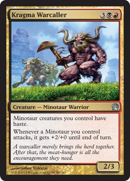 -. Binding : Toy -. Brand : Magic: the Gathering -. Color : Multi-Color -. Edition : Theros -. Feature : A single individual card from the Magic: the Gathering (MTG) trading and collectible card game (TCG/CCG). / This is of Uncommon rarity. / From the Theros set. -. Genre : Fantasy -. IsAdultProduct : 0 -. ItemPartNumber : 195 -. Label : Wizards of the Coast -. Manufacturer : Wizards of the Coast -. MPN : 195/249 -. PackageQuantity : 1 -. PartNumber : 195/249 -. ProductGroup : Toy -. ProductTypeName : TOYS_AND_GAMES -. Publisher : Wizards of the Coast -. Studio : Wizards of the Coast -. Title : Magic: the Gathering - Kragma Warcaller (195/249) - Theros