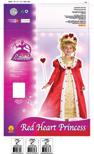 -. Binding : Toy -. Brand : Rubie's -. ClothingSize : One Size -. Color : multi-colored -. Department : girls -. Feature : Red Heart Princess is a vision in gold, red and hearts / Gold dress with attached red robe, both decorated with hearts / Red heart headpiece and scepter included / Costume is available in child sizes Small (4-6), Medium (8 to 10) and Large (12) / Rubie's brings fun to dress-up with costumes and accessories kids play with all year long -. IsAdultProduct : 0 -. Label : Rubies - Domestic -. Manufacturer : Rubies - Domestic -. MPN : 883898 -. PackageQuantity : 1 -. PartNumber : 883898 -. ProductGroup : Toy -. ProductTypeName : BABY_COSTUME -. Publisher : Rubies - Domestic -. Size : One Size -. Studio : Rubies - Domestic -. Title : Rubie's Red Heart Princess Costume -. Warranty : Guaranteed against manufacturer defects