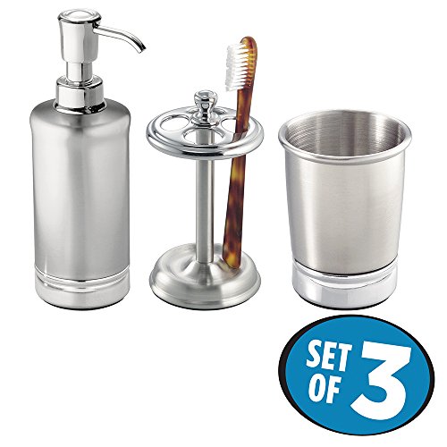 mDesign Classic Stainless Steel Soap Dispenser Pump, Toothbrush Holder Stand, Tumbler for Bathroom Vanities - Set of 3, Brushed/Chrome