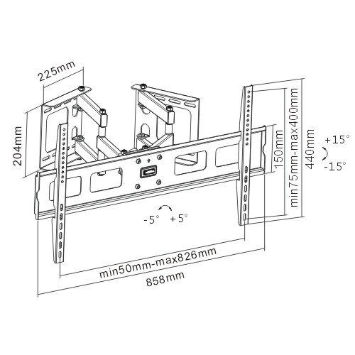 - Feature : Unique dual wall plate designed especially for corners. Can also be used for flat walls / Universally fits most LCD LED and Plasma TVs from 37-63" up to 132lbs (Max VESA 800x400) / Arm extension: 125 ~ 515mm (5 ~ 20") / Tilt: -15° ~ +15° up and down, Swivel (side to side): 60° / Installed bubble level