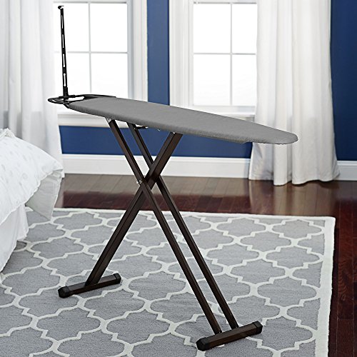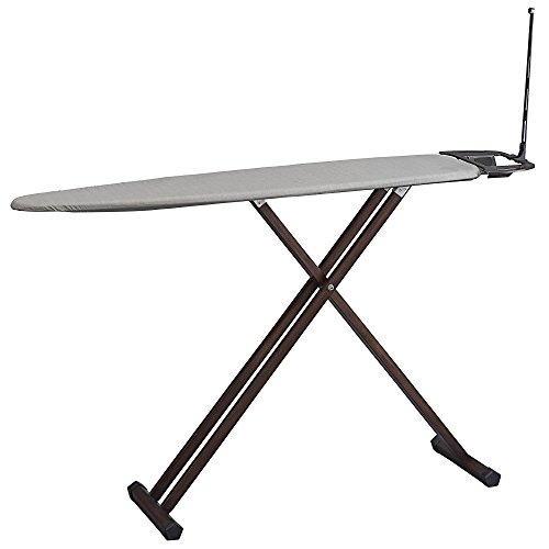 Household Essentials Deluxe Tri-leg Wood Ironing Board comes with an attached Iron Rest and Cord Minder for an exceptional ironing experience. This board's beautiful, dark legs are made from Eucalyptus, a wood that is strong, long-lasting, and easy to maintain. The thicker feet of the board are cut as hexagon for subtle style and better stability. And, of course, this board has all the features you expect from a Household Essentials ironing board: 4-height adjustment for comfortable ironing, and attached iron rest and cord minder for easy convenience, and metal leg lock that holds legs securely in place for storage. This attractive board comes with a one-piece cover and pad with a 5-milimeter fiber pad and bungee cord binding that provides a secure, matte-free ironing surface. It's a high-quality board with a traditional design that will last. The board measures 31-37 inches high (with height adjustment), 14 inches wide, and 54 inches deep.