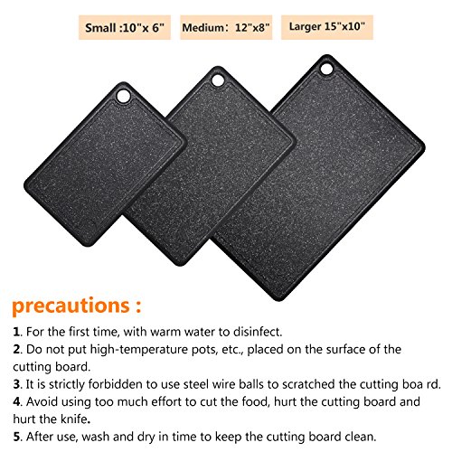 - 【MULTIPLE SIZES OF CUTTING BOARDS IN PACK】-- Each order comes with three distinct cutting board sizes, including small (10*6*0.3 Inches), medium(12*8*0.3 Inches) and large(15*10*0.3 Inches); perfect for multi-course meals or all-day use.