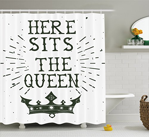 Queen Shower Curtain by Ambesonne, Vintage Grunge Here Sits The Queen Quote Antique Crown Royalty Theme Hipster, Fabric Bathroom Decor Set with Hooks, 70 Inches, Charcoal Grey
