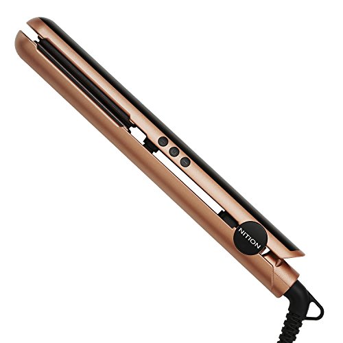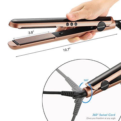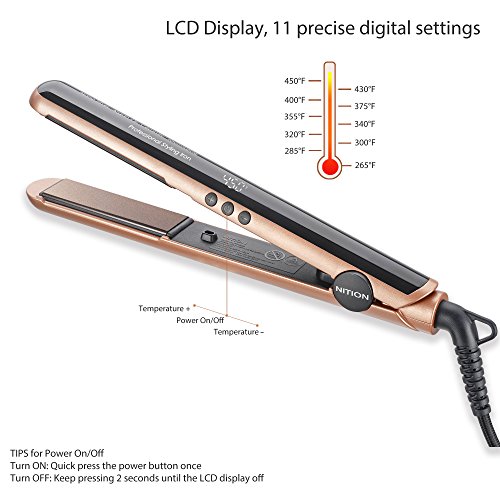 Studio : Nition Publisher : Nition Binding : Misc. Product Description NITION New Breakthrough TECH The enhanced ceramic coated plate which is infused with Nano Sliver, Argan oil, Tourmaline, helps avoid pulling or damaging your hair while styling, lock in natural moisture. Nano Silver Nano-silver ion is a kind of safe material. It has been widely used in health care, environmental purification, medical treatment, cosmetics, textiles and the other fields. Argan Oil Argan oil can restore the hair moisture and make your hair soft, slick and shiny. It also can prevent your hair ends splitting, smooth your frizz hair, repair damaged hair follicles and resist to ultraviolet light. Tourmaline Tourmaline can emits negative ions and reduce the formation of static electricity. It also can release far infrared and help heat quickly and evenly distribute to reduce heat damage to hair. Specifications: Temperature Range: 265°F -450°F 11 settings:265/285/300/320/340/355/375/400/410/430/450°F Low Power:48 Watt Input Voltage:100-127V 50/60Hz U.S Plug(2 Pin) with 360° swivel cord, 9ft in length *Please be kind noted,if you travel to other countries which use 220V Voltage,e.g,Europe,UK,Asia,you might need to take a Universal Travel Adapter 220V to 110V Voltage Converter with you Package: 1 x NITION Hair Straightener 1 x User Manual Recommend Setting: 265°F -338°F for Fine 356°F -374°F for Medium 392°F -410°F for Thick 428°F -450°F for Very Thick *Please choose the suitable temperature according to your hair type before using. *Drying your hair first,it is not designed for wet hair. Memory your last favorite temperature setting by "Turn OFF",not unplug the power cord TIPS for Power On/Off NITION Hair Flat Iron: Turn ON:Quick press the power button once. Turn OFF:Keep pressing 2 seconds until the LCD display off.