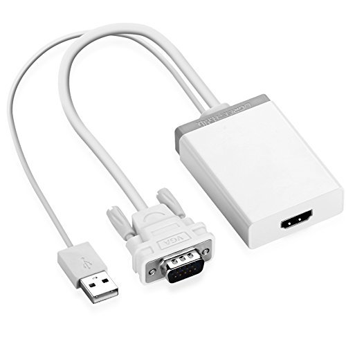 -. Feature : VGA to HDMI adapter offers you a convenient way to connect PCs, Laptops with VGA to displays such as Projectors, Monitors, and HDTVs with HDMI etc.with a HDMI cable(Sold separately, ASIN: B00LN3TN9M) / This VGA to HDMI converter is with built-in chipset, convert VGA and USB audio analog signal to HDMI digital signal without signal loss / Supports synchronized video and audio over one cable, 1080P and 1600x1200 resolutions; Simple installation, just plug & play / Transmit audio signal from the USB on the computer and embeds it to the HDMI output along with video / USB interface support both audio and charge at the same time, no extra power adapter needed; The VGA and USB cable length is 20inch