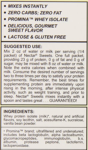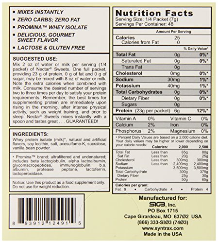 -. Binding : Health and Beauty -. Brand : Syntrax -. EAN : 0893912124915 -. Feature : 26 grams powder / Nectar grab n' go is considered to be the cleanest, most soluble and best tasting protein powder on the market / Nectar grab n' go contains the purest whey protein ever created -. IsAdultProduct : 0 -. Label : Syntrax -. Manufacturer : Syntrax -. Model : 893912124915 -. MPN : SYNTGRAB0021VANIPK -. NumberOfItems : 1 -. PackageQuantity : 1 -. PartNumber : SYNTGRAB0021VANIPK -. ProductGroup : Health and Beauty -. ProductTypeName : HEALTH_PERSONAL_CARE -. PublicationDate : 2011-07-01 -. Publisher : Syntrax -. Studio : Syntrax -. Title : Syntrax Nectar Sweets Grab N Go, Vanilla Bean Torte, 12 Packets, 11.4 oz. -. UPC : 893912124915