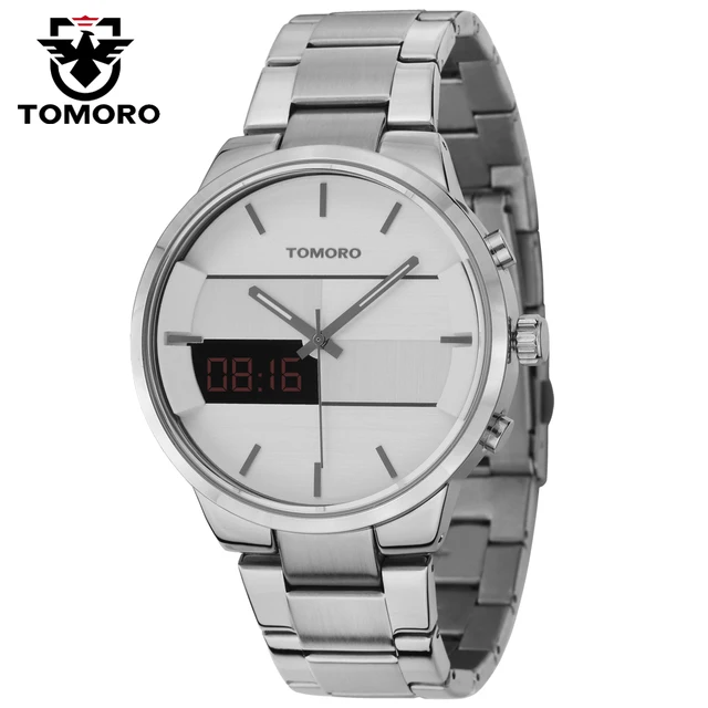 패션 간단한 세련된 최고 럭셔리 브랜드 TOMORO 디지털 LCD 시계 남성 닦았 스틸 밴드 다이얼 석영 시계 시계 남자 2016, 남자 시계, 패션 시계, led 시계, 디지털 시계, 뜨거운 시계, 판매 시계, 비즈니스 시계, 유명한 시계, 브랜드 시계, 품질 시계, 새로운 도착 시계, 브랜드:TOMORO 운동:Origital 일본 AL32 석영 운동 및 사용자 정의 디지털 운동 유리:경도 스트랩:스테인레스 스틸 기능:아날로그 디지털 듀얼 타임, 달력, LED 백라이트 방수:3ATM 측정: 직경 케이스:45 미리메터 두께 케이스:13.5 미리메터 폭 스트랩:22 메터 손목 길이 시계:210 미리메터 그물 무게:150 그램 포장:TOMORO TMR8817 원래 시계 원래 선물 상자 참고:방수 3ATM (우리는 stricked 방수 표준, 모든 시계 테스트 있어서 3ATM 방수 장비) 가장 정상적인 수명 물 저항 행사 저항 실수로 연락처 물, 같은 빗물, 스플래쉬 또는 세척 손 1. 디지털 디스플레이 버튼: 후 눌러 한번, 표시 밝은 클리어 LED 번호, 동시에, 그것은 디스플레이 시간, 모델분처럼-월 일-두번째, 버튼을 누르면 각 시간 후. 2. 크라운: 조정 아날로그 3. 설정 디지털 시간 버튼: 버튼을 누르면 각, 디지털 화면 순환 디스플레이 달력 달 일 시간 분, 때 월 일 시간 분 디스플레이 단품으로, 다음글 눌러 오른쪽 상단 버튼 조정 네 값 ( 월 일 시간 분) 하나. 포장 상세