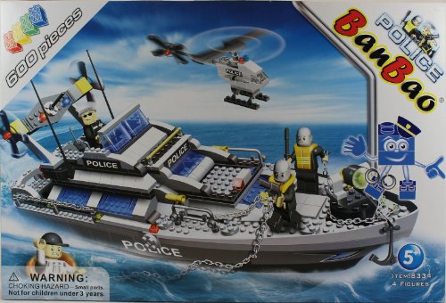 -. Binding : Toy -. Brand : BanBao -. EAN : 0850484003284 -. Feature : Set Includes 4 figures / For ages 5+ years / Offers tons of Constructive Options and Hours of Play Value / 100% fit and compatible with L.E.G.O / Made from sturdy non-toxic plastic -. Label : J & S Global Trading -. Manufacturer : J & S Global Trading -. Model : 8334 -. MPN : BB9001-8334 -. PackageQuantity : 1 -. PartNumber : BB9001-8334 -. ProductGroup : Toy -. ProductTypeName : TOYS_AND_GAMES -. Publisher : J & S Global Trading -. Studio : J & S Global Trading -. Title : BanBao Civil Services Large Set Police Boat - 600 Pieces -. UPC : 850484003284 -. Warranty : No Warranty