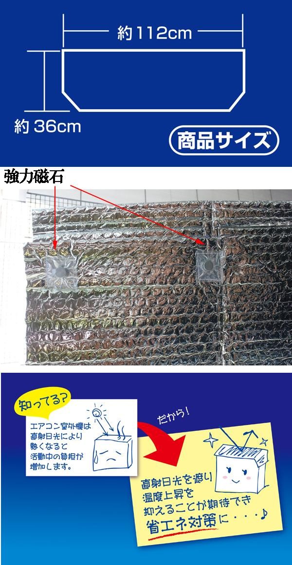 エアコン室外機は直射日光により熱くなると、活動中の負担が増加します。室外機保護フードを装着することによって直射日光を遮り、温度上昇を抑えて省エネ対策になります。また、室外機を雨や雪・汚れから守ります。8個の強力磁石で装着するだけなので簡単です。 |