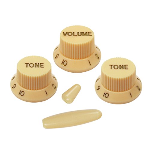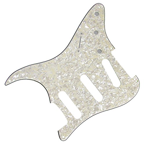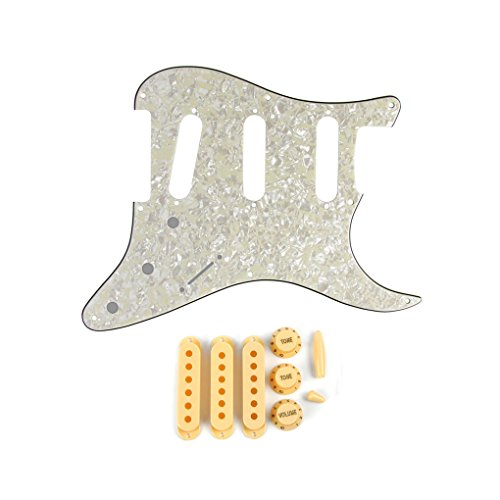 Product Description Feature:* Set of 8 holes gutiar pickguard, pickup covers, knobs and tips Fits USA Vintage 8 hole Fender Style Strat Style Guitar Replacement/ 50s ST Style.* All materials are environmentally friendly, thermostability, no smell. Multi-layer plates are pressed under high temperature and pressures, to make them close integration between each layer, will not appear curly, deformation, or separation of different layers.* Two layers of protective films on the front of pickguards, anti-scratch to protect the guitar.Specification:*Pickguard: SSS(single/single/single coil) style pickguard; 8 screws holes in the side of pickguard.* Material: Pickguard is made of 4Ply, including 3Ply PVC and 1Ply Celluloid Pearl Plate; Guitar Parts: Plastic PVC.* Pickup covers: 52/52/52mm for single coil pickups.* Knobs: 2 pcs Tone and 1pcs Volume knobs* Swith Tip: for a 5 Way Strat Style Guitar switch or similar.* Whammy Bar Tip: about 5mm inside diameter.* Pickguard Color: Aged Pearl; Guitar Parts' Color: Cream, as pictures showen.* Note: Item's color might be different from the picture because of the aberration. Package Includes:1 x Pickguard3 x Pickup Covers2T1V Knobs1 x 5 Way Switch Tip1 x Bar Tip 0