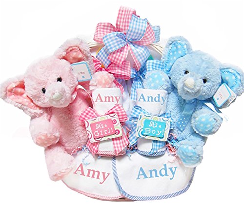 -. Feature : 2 dottie eared elephants; 2 fork & spoons / 2 personalized baby bibs - send email with first names and gender / 2 Baby Hooded Towels / 2 rattle teethers; 2 personalized burpcloths / nursery basket