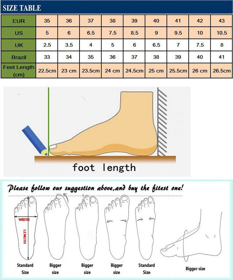 Tips: Measurements are the maximum size,please allow appr 0.5-1cm tolerance. Compare the chart size with your feet length carefully before ordering