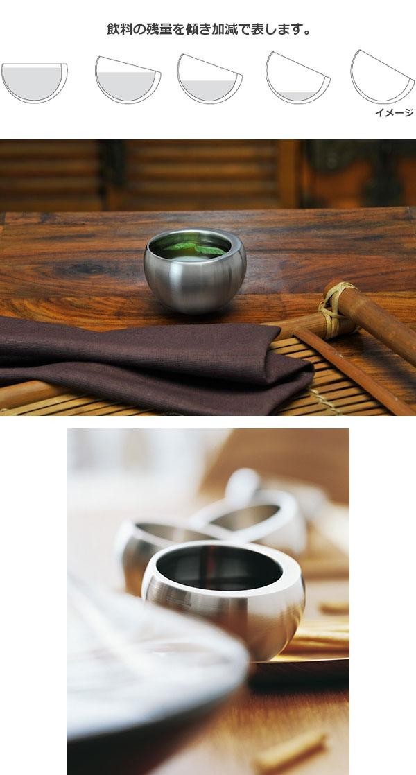 | 「BALANCE」は、文字通りのバランスカップです。空の状態では横に傾き、飲料を満たせば満たすほど垂直に立ち上がります。また飲めば飲むほど、横へ傾いていき、残量を自らの傾き加減で表します。中真空の二重構造なので手の熱が内容物に影響しません。グっと飲み干せば盃が先にフラッときてくれ、継ぎ足すと立ち上がる。パーティの話題になる名脇役です♪ |