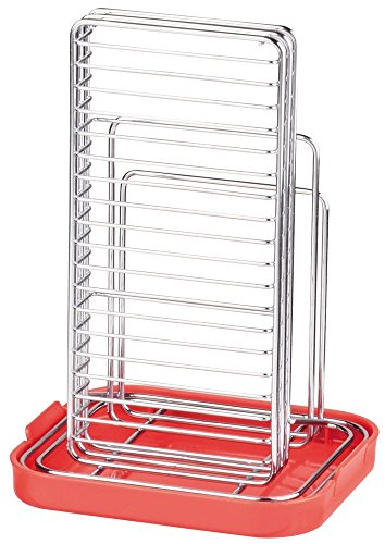 -. Feature : 【サイズ】幅160×奥行135×高さ230mm【本体重量】(約)360g / 【材質】本体/鉄(クロムめっき+クリア樹脂塗装)、トレー/ポリプロピレン(耐熱温度100度) / 【カラー】レッド、ホワイト、ブラック / 【原産国】本体/中国、トレー/日本 / 【特徴】スタイリッシュなフォルムにカラーアクセントをつけてより印象的に。防サビ加工。トレーは外して洗えます。厚さ約25mm以下と15mm以下のまな板を立てて置けます。柄元から先端までの長さが約200mm以内の包丁もまな板と一緒に立てて収納できます。