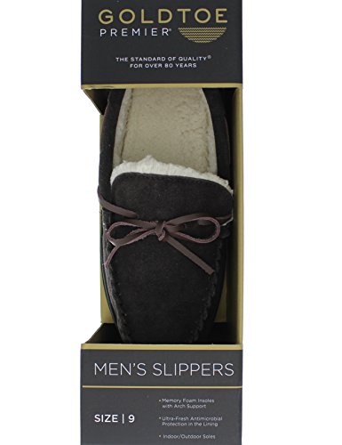 -. Binding : Apparel -. Brand : Gold Toe -. Department : mens -. Feature : Classic mens suede moccasins with whip-stitched toe and boat-like around-the-collar lacing / Contoured footbed with arch support, dual density memory foam insole and indoor outdoor traction outsole / Ultra-fresh antimicrobial protection in the plush sherpa lining / READY FOR GIFTING: These luxurious slip on moccasin slippers are shoeboxed for a great gift idea and practical present for men / GOLDTOE® a leader of Standard & Quality® for over eight decades -. Model : Benton -. ProductGroup : Shoes -. ProductTypeName : SHOES -. Title : Gold Toe Premier Men's Benton Memory Foam Cow Suede Sherpa Lined Slip-On Moccasin Slipper