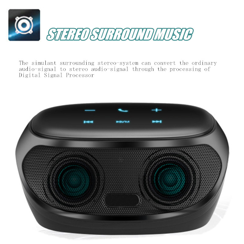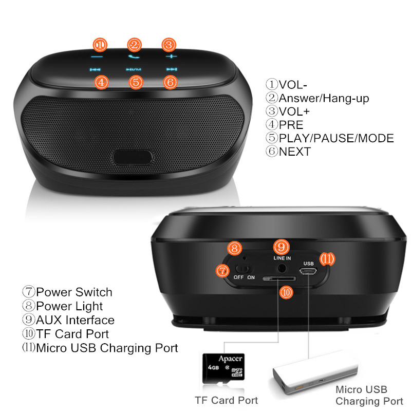 This stereo Bluetooth speaker is specially designed for cell phone, laptop/Tablet PC with Bluetooth function. Standard USB/ DC charging port, TF card port and audio input port make you easily enjoy your favorite stereo surround sound music.